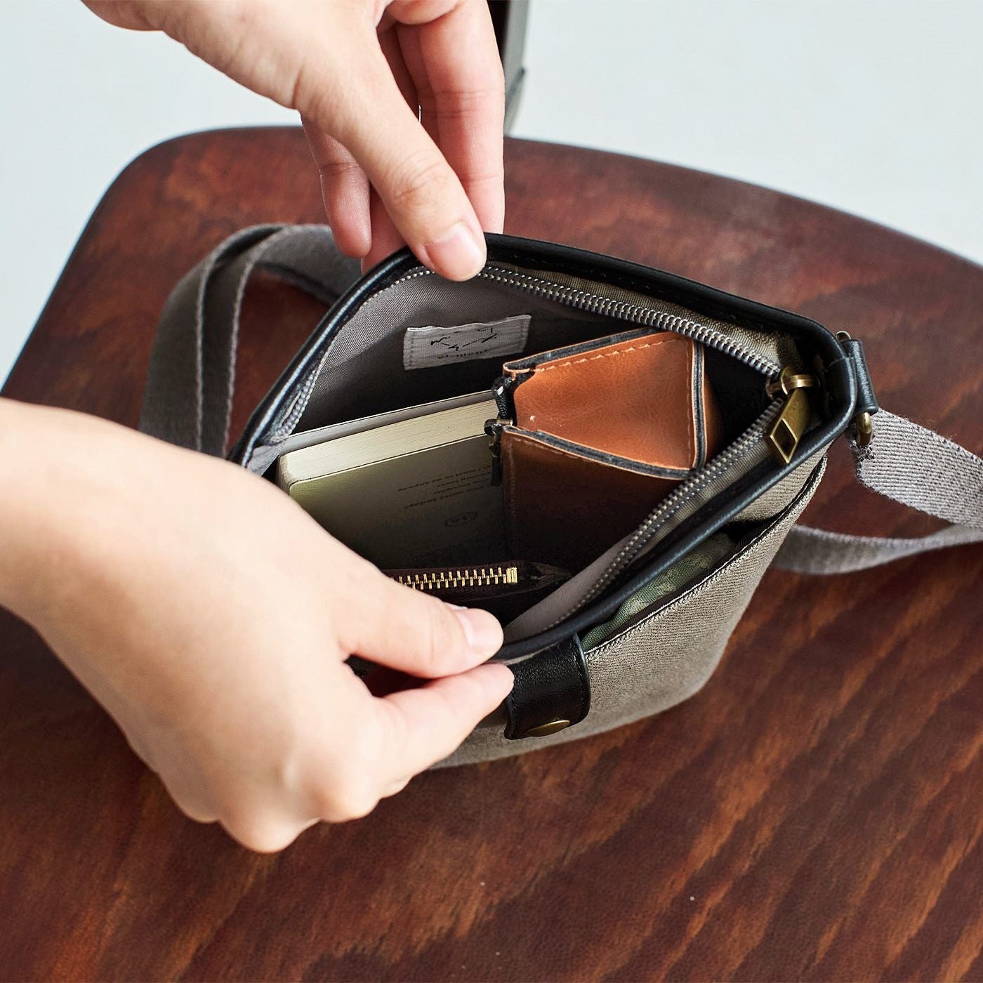こぶりなショルダーバッグですが、約6cmのまちで見た目以上に大容量です。ポケットのない服や、リュックですぐに荷物を取り出したいとき、オフィスで必需品を身につけていたいときに便利です。口部分は本革で上品に。メインポケットはファスナー付きで、外ポケットはさっと開閉できるマグネット付きです。