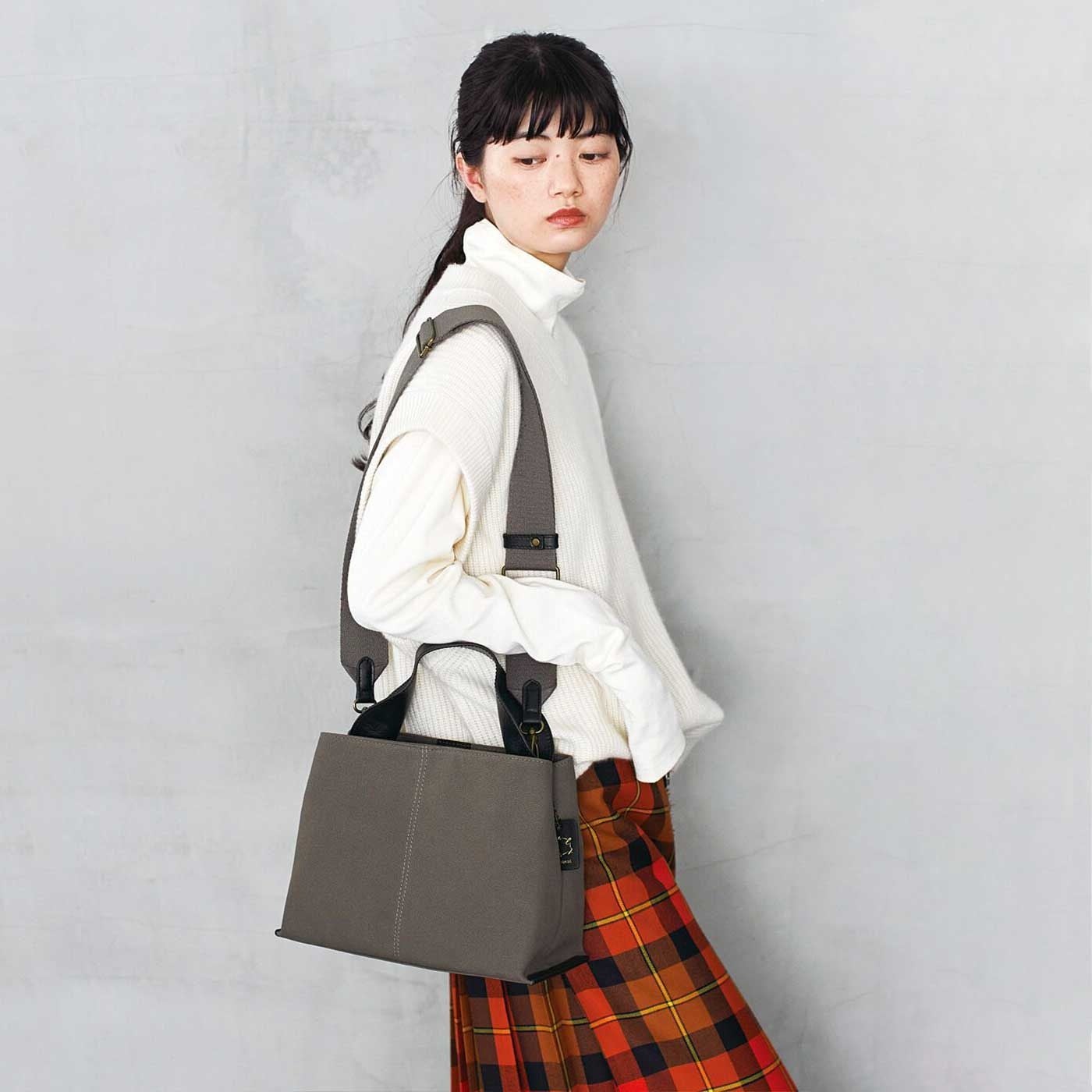 通勤や通学にもちょうどいいこぶりなバッグです。約11㎝のまちで底にお弁当を入れやすく、マイボトルや財布、ポーチなど、毎日の必需品が収まるほどよいサイズ感です。革の持ち手はあえて太く、着脱できるショルダーストラップは幅約5cmと、肩や手への負担を軽減しながら、デザインにアクセントをつけています。