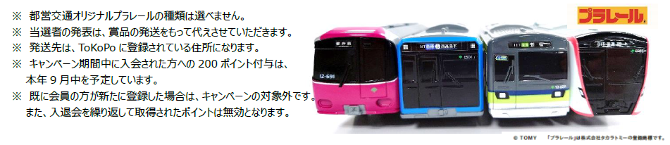 キャンペーン期間中にToKoPoへ新規ご入会いただいた小学生以下のお客様全員に「200ポイント」をプレゼントいたします。さらに期間中、都営地下鉄、都営バス、東京さくらトラム(都電荒川線)及び日暮里・舎人ライナーの都営交通4事業のうち2事業を利用された方の中から抽選で30名様に、都営交通オリジナルプラレールをプレゼントします。