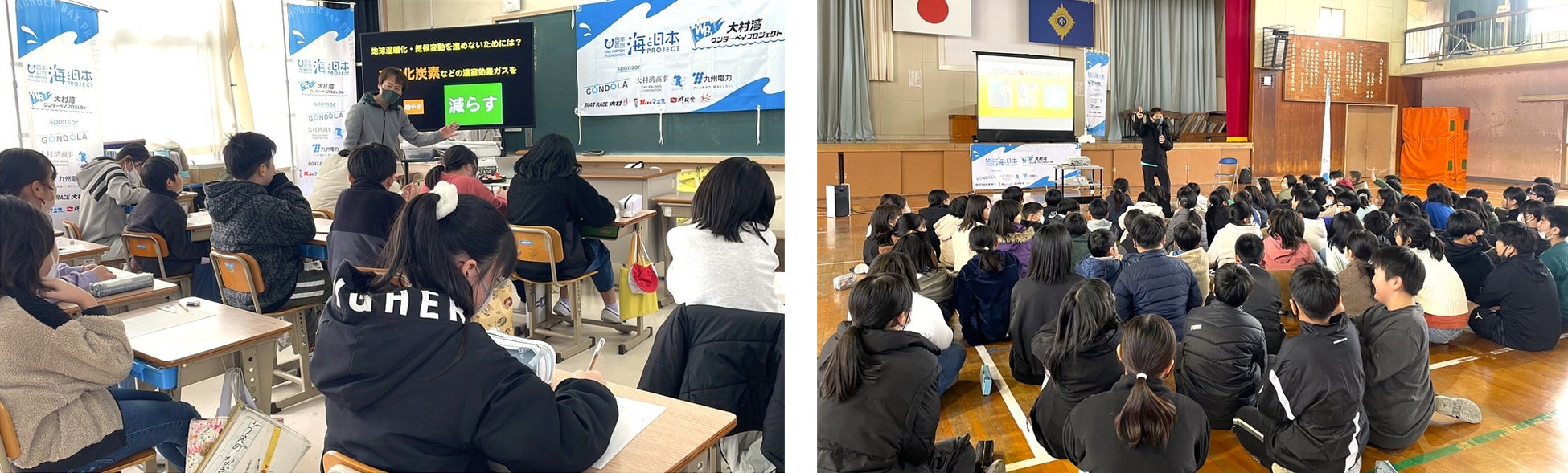 2024年12月に長崎大学水産学部と連携して行った「大村湾調査2024」の調査結果を基に、海藻と海の関わり、海で起きている問題や温暖化について、長崎県内の小学校5校の子どもたちが学びました。