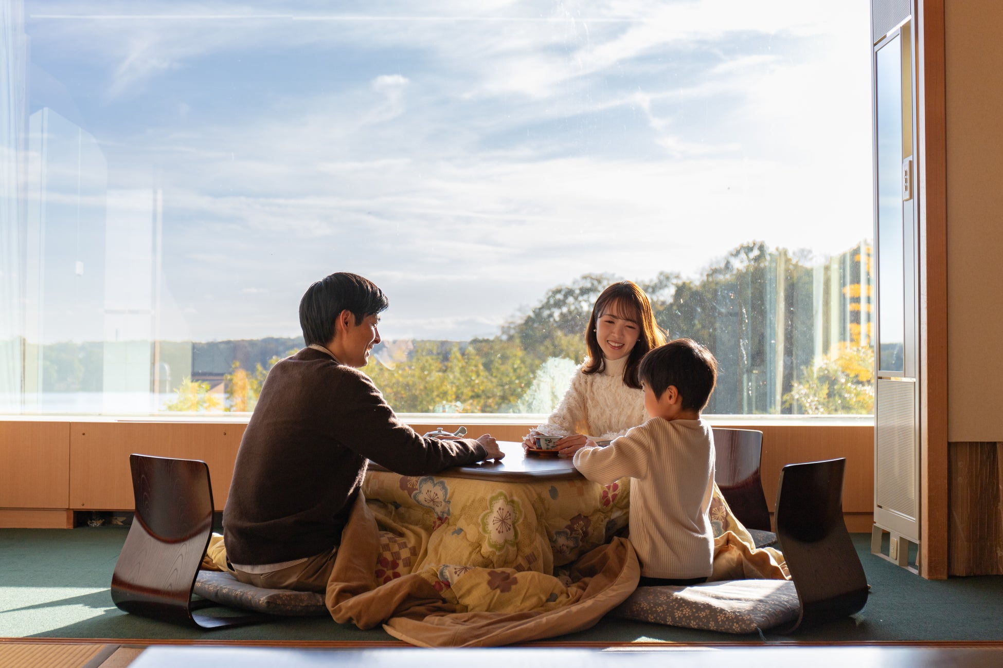 ●冬の情緒に浸る 2 室限定「こたつ付き多摩湖ビュー和室」にて、星空観察後の冷えた体を温め、 情緒あふれる特別な親子でのくつろぎのひとときをご提供。