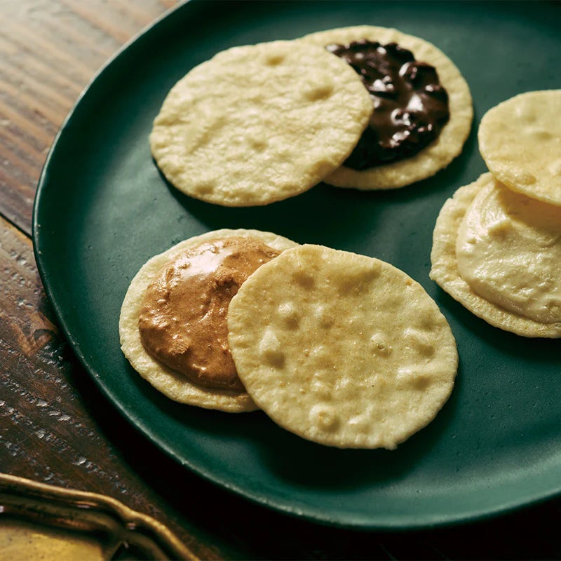 パリッと軽やかな煎餅に、洋菓子の発想で生まれた口溶けなめらかなクリームを挟んだ、日本茶はもちろん紅茶や珈琲とも相性のよい「煎餅サンド」3種類の詰め合わせです。