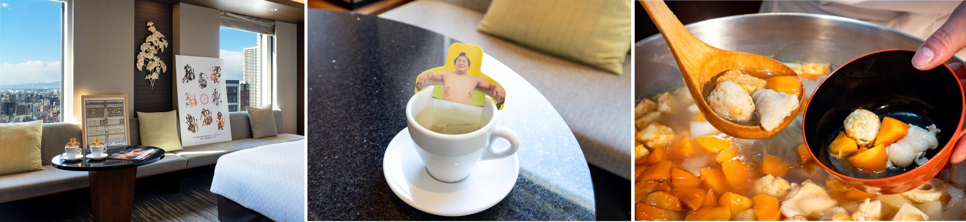 大阪に春の訪れを告げる伝統文化、大相撲三月場所。力士たちが繰り広げる迫力ある熱戦を「マスA席」からご覧いただける宿泊プランをご用意しました。お部屋にはホテル日航大阪にしかない上位8力士の実物大手形を集めたパネルや三月場所番付表を展示して大相撲の世界観を演出するほか、三月場所パンフレットと、力士がティーカップの中でひと休みしているような「力士玄米茶」もご用意します。また、カフェレストラン「セリーナ」の朝食ブッフェでは、三月場所の開催にちなんでセリーナオリジナルちゃんこを提供いたします。