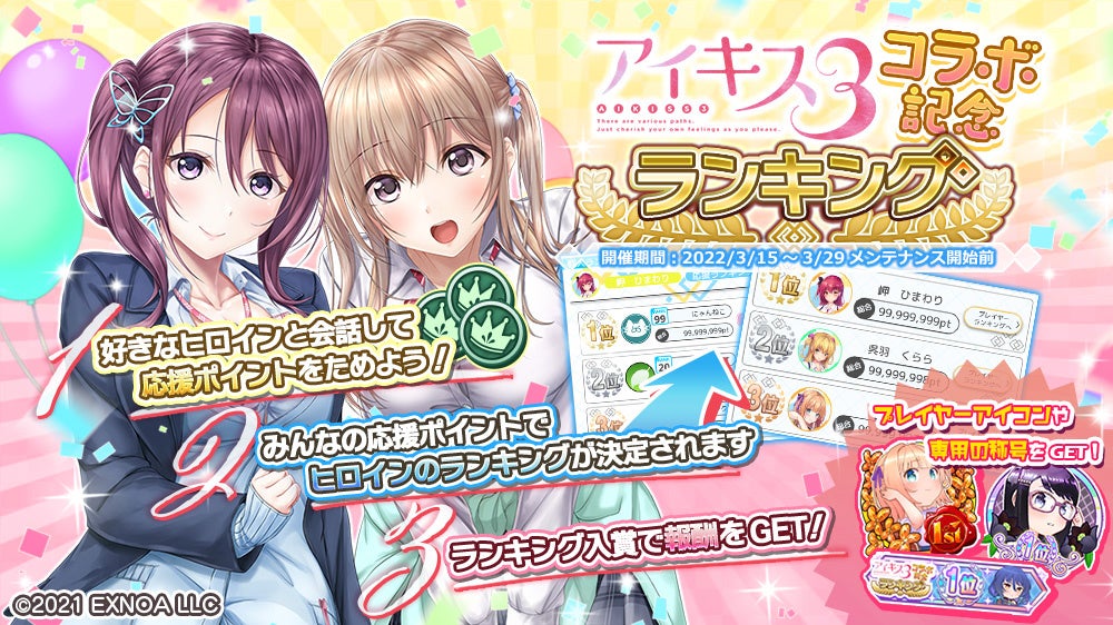 3月15日~3月29日の期間にて「アイキス3コラボ記念ランキング」を開催中です!好きなヒロインと会話をするとお相手の女の子に応援ポイントがたまっていきます。蓄積された応援ポイントの総計によりヒロイン別人気ランキングが決定!さらにヒロイン別に応援ポイントを多く投じていただいた方には限定報酬獲得のチャンス!ぜひ奮ってご参加ください!