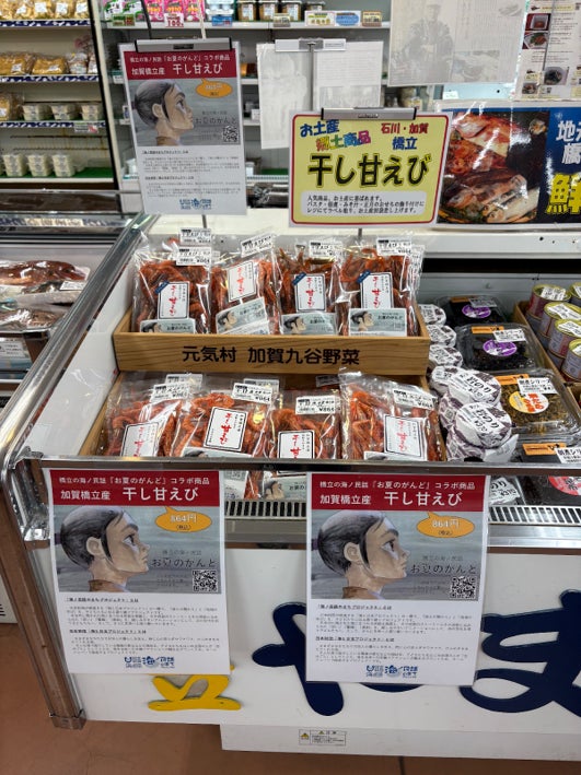 一般社団法人日本昔ばなし協会と日本財団が取り組む「海ノ民話のまちプロジェクト」では、石川県加賀市に伝わる民話「お夏のがんど」のコラボレーションとして、石川県加賀市の海産物の卸売業、小売業である、やまは水産株式会社と連携し、コラボ商品である「加賀橋立産 干し甘えび」を2025年3月11日(火)から発売開始いたしました。