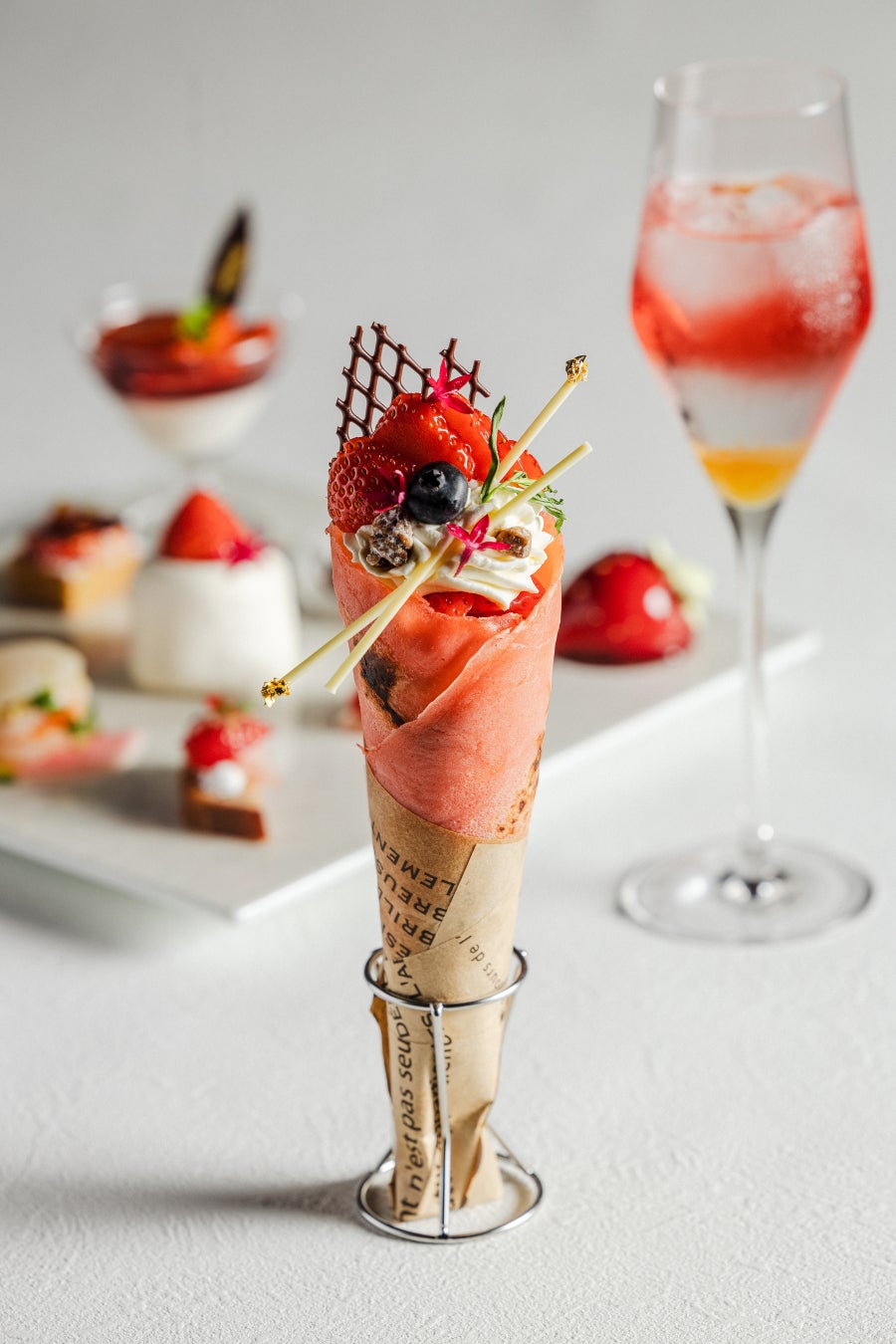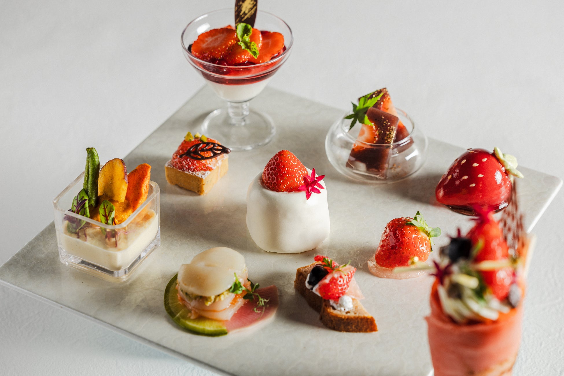 「いちごアフタヌーンティー~Strawberry Symphony~」は、「いちごの芳醇な香りと多彩な味わい、豊かな食感が奏でるシンフォニー」をコンセプトに、甘みと酸味のバランスに優れたいちごをふんだんに使用した愛らしいプティフールと、冬の旬な食材が織り成すセイボリーが彩りを添える、華やかなアフタヌーンティーです。一口ごとに異なる味わいと食感が楽しめるよう、丁寧に仕上げました。