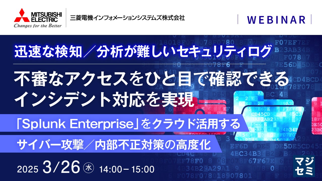 マジセミ株式会社は「迅速な検知/分析が難しいセキュリティログ、不審なアクセスをひと目で確認できるインシデント対応を実現」というテーマのウェビナーを開催します。