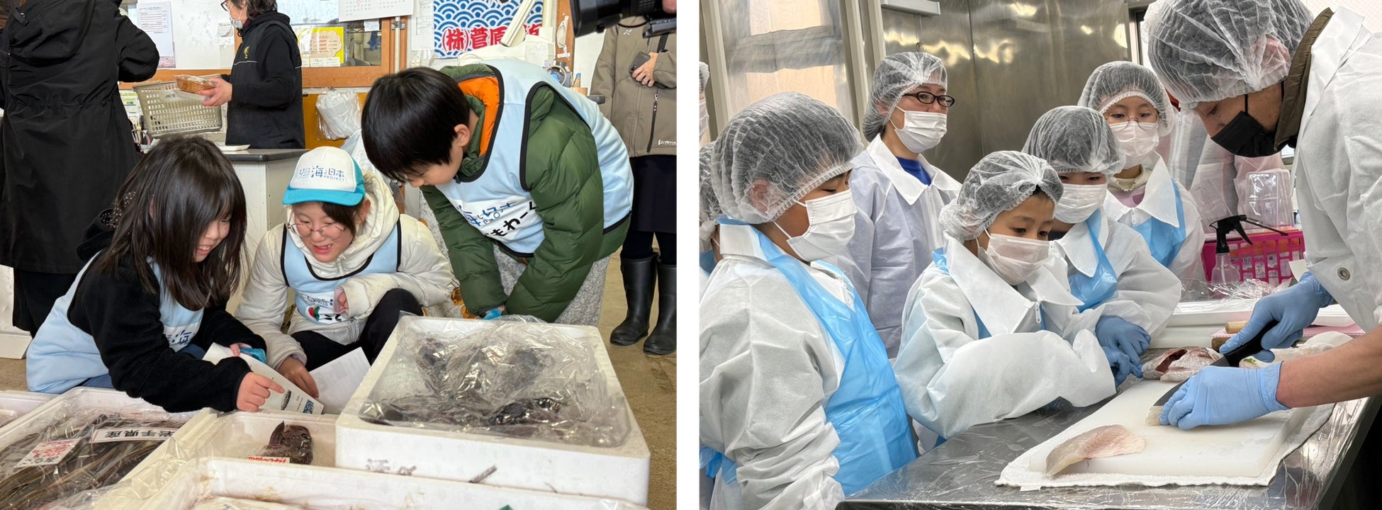 加工された売り場では、これから自分でもさばくお手本として説明を受けながら見学。実際に魚をさばく体験をし、お刺身にするまでの作業を真剣な表情で取り組んでいました。