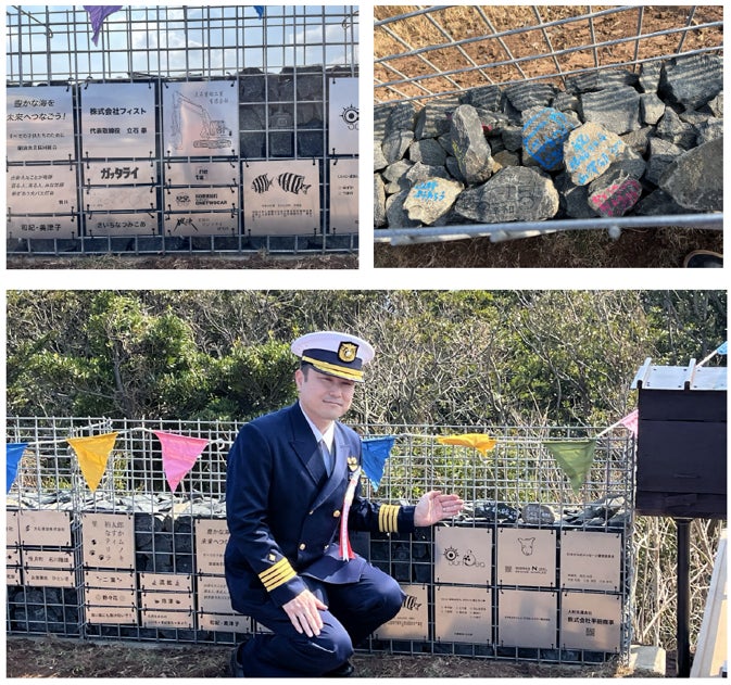 その安全柵の1つは、願い事を書いた石を詰めるガビオン柵です。訪れた人が石に願い事を書いてこのガビオン柵に詰めることで、何年か後に訪れるきっかけにする狙いです。また、柵には協賛を募集し、協賛プレートを設置しました。小学校の卒業記念にお名前を入れたり、お子さんのイラストや、家族からのメッセージ、はたまた地元企業のPR看板だったり、自由にメッセージを発信していただくことができます。(協賛プレートは今後も引き続き募集しています)