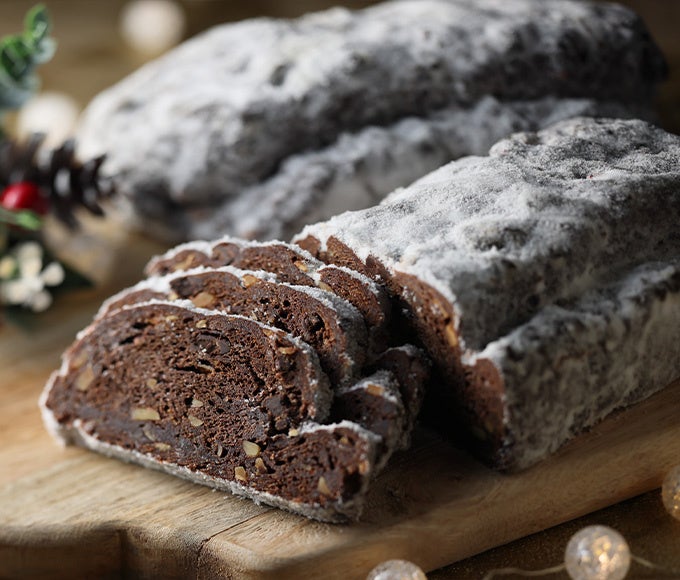 フランス産のチョコレート、ローストしたアーモンド、オレンジピールをココアベースのシュトーレン生地に練り込み仕上げた、ショコラバージョンのシュトーレン。