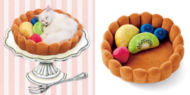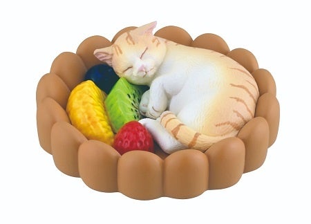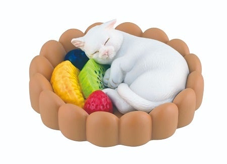 おいしそうなタルト生地の上で猫がフルーツと仲よく眠るデザインです。猫は(茶白)と(しろ)の2タイプがあります。寝息が聞こえてきそうな猫たちのリアルな表情と、ぽってりとしたやわらかそうなボディーにメロメロです。