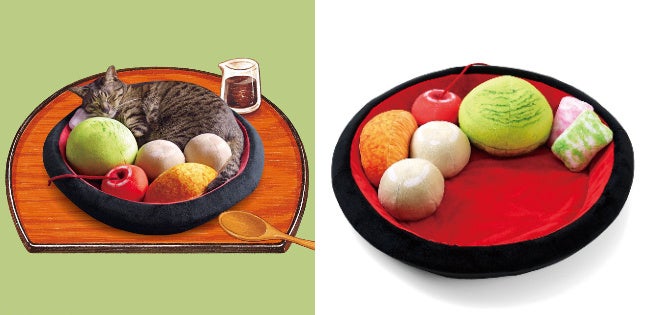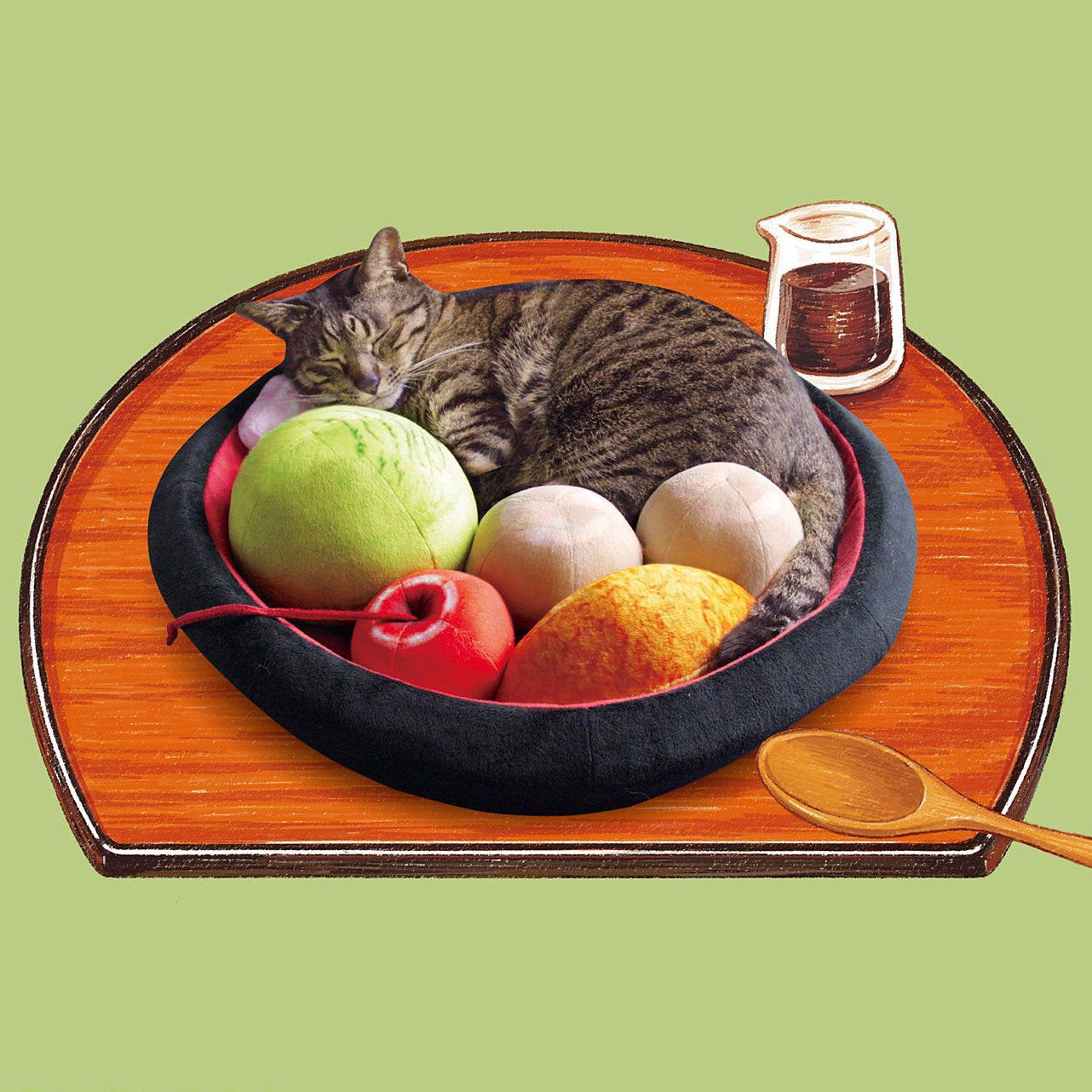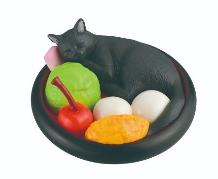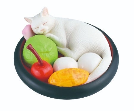 あんみつの和の器の中で、つや感がリアルな白玉、抹茶アイス、フルーツなどといっしょに猫が眠るデザインです。気持ちよさそうな表情は見ているだけで癒やされます。猫は(しろ)と(くろ)の2タイプがあります。白黒2匹並べたくなるかわいさです。
