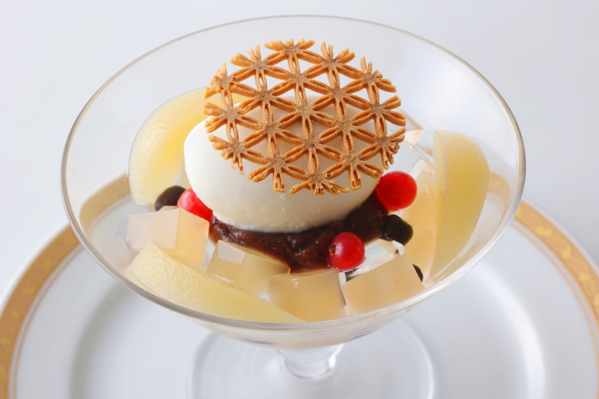 華やかな高座で人気の「蝶花楼桃花」の一皿は、瑞々しい白桃を使ったコンポートのあんみつに、ミルクジェラートを添えて。女性らしい凛とした華やかさを映した、見た目にも涼やかなデザートです。