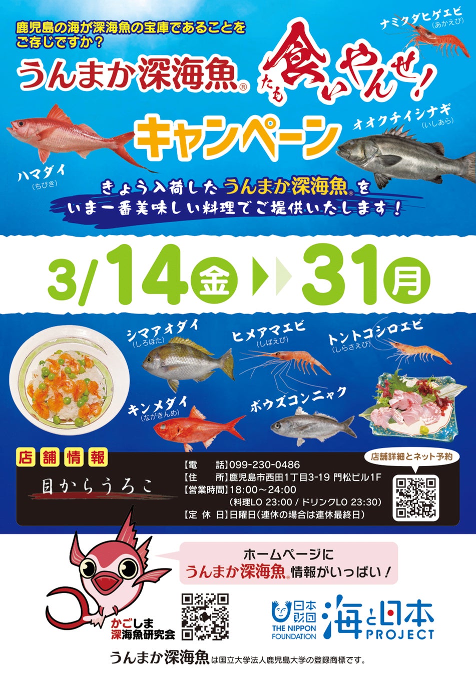 一般社団法人 海と日本PROJECT in鹿児島は、「かごしま深海魚研究会」「目からうろこ」とコラボレーションし、鹿児島の海の豊かさと未来のため、2025年3月14日(金)から『うんまか深海魚 食(たも)いやんせ!』メニューのPR期間を開始いたします。この取り組みは、次世代へ豊かで美しい海を引き継ぐために、海を介して人と人とがつながる“日本財団「海と日本プロジェクト」”の一環です。