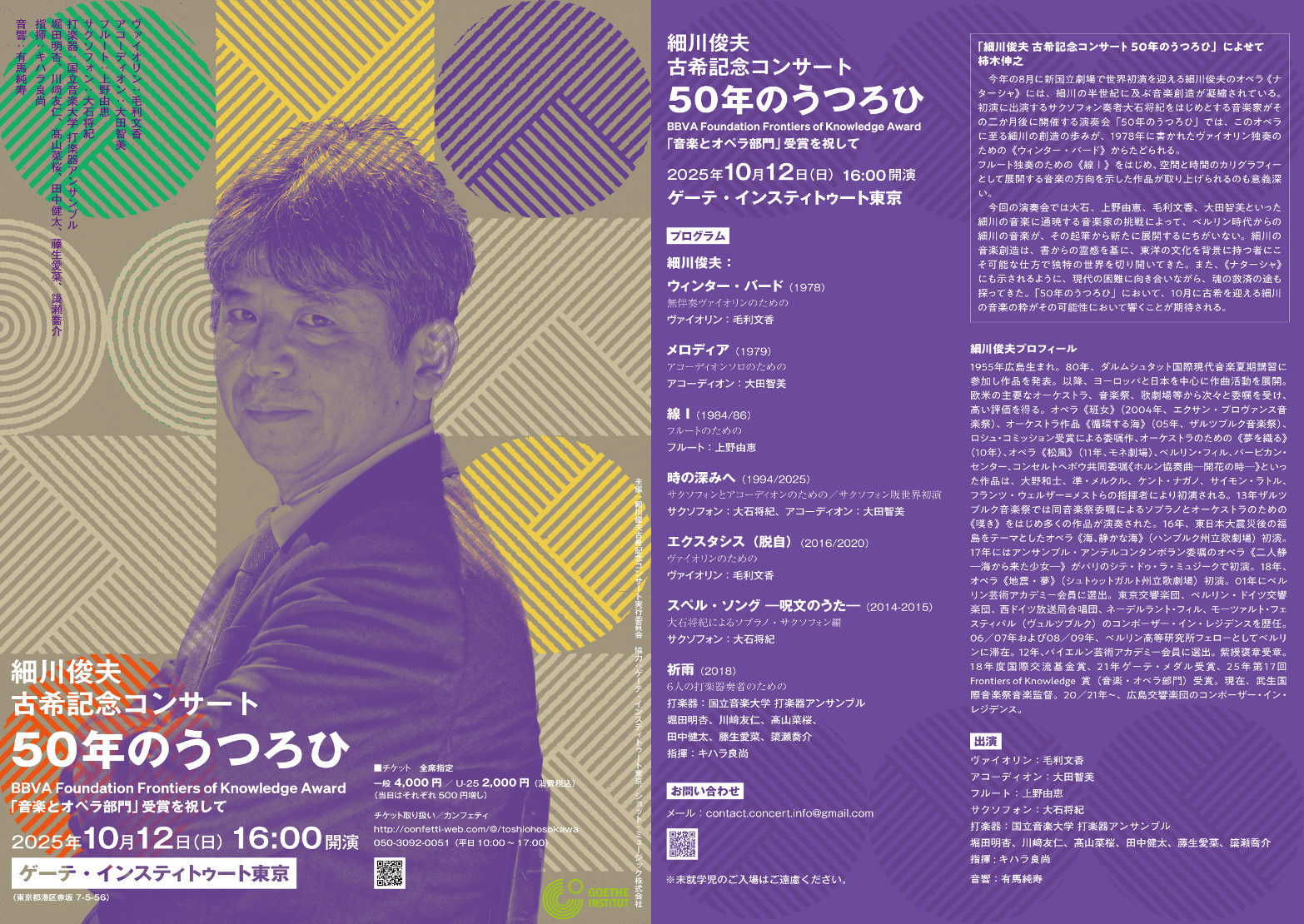 細川俊夫古希記念コンサート実行委員会主催、『細川俊夫 古希記念コンサート 50年のうつろひ』が2025年10月12日 (日)にゲーテ・インスティトゥート東京(東京都 港区 赤坂 7-5-56)にて開催されます。 チケットはカンフェティ(運営:ロングランプランニング株式会社、東京都新宿区、代表取締役:榑松 大剛)にて発売中です。