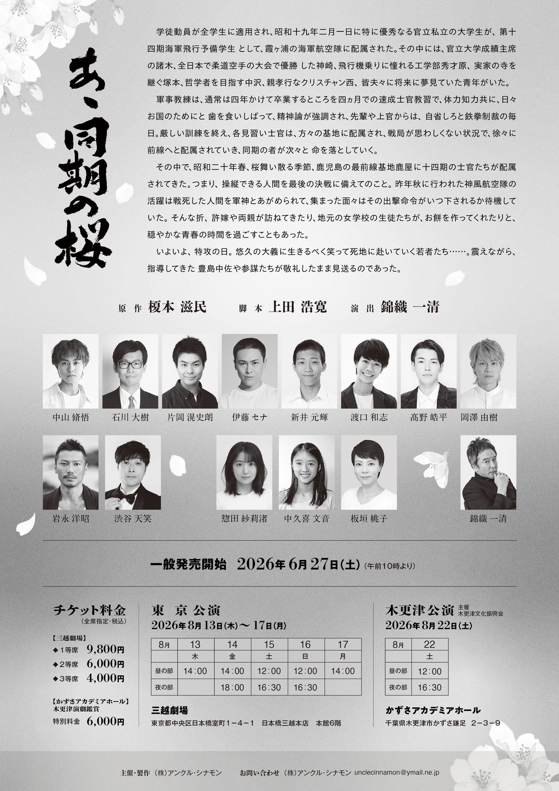 2026年8月、東京・三越劇場、木更津・かずさアカデミアホールにて舞台「あゝ同期の桜」の上演が決定いたしました。