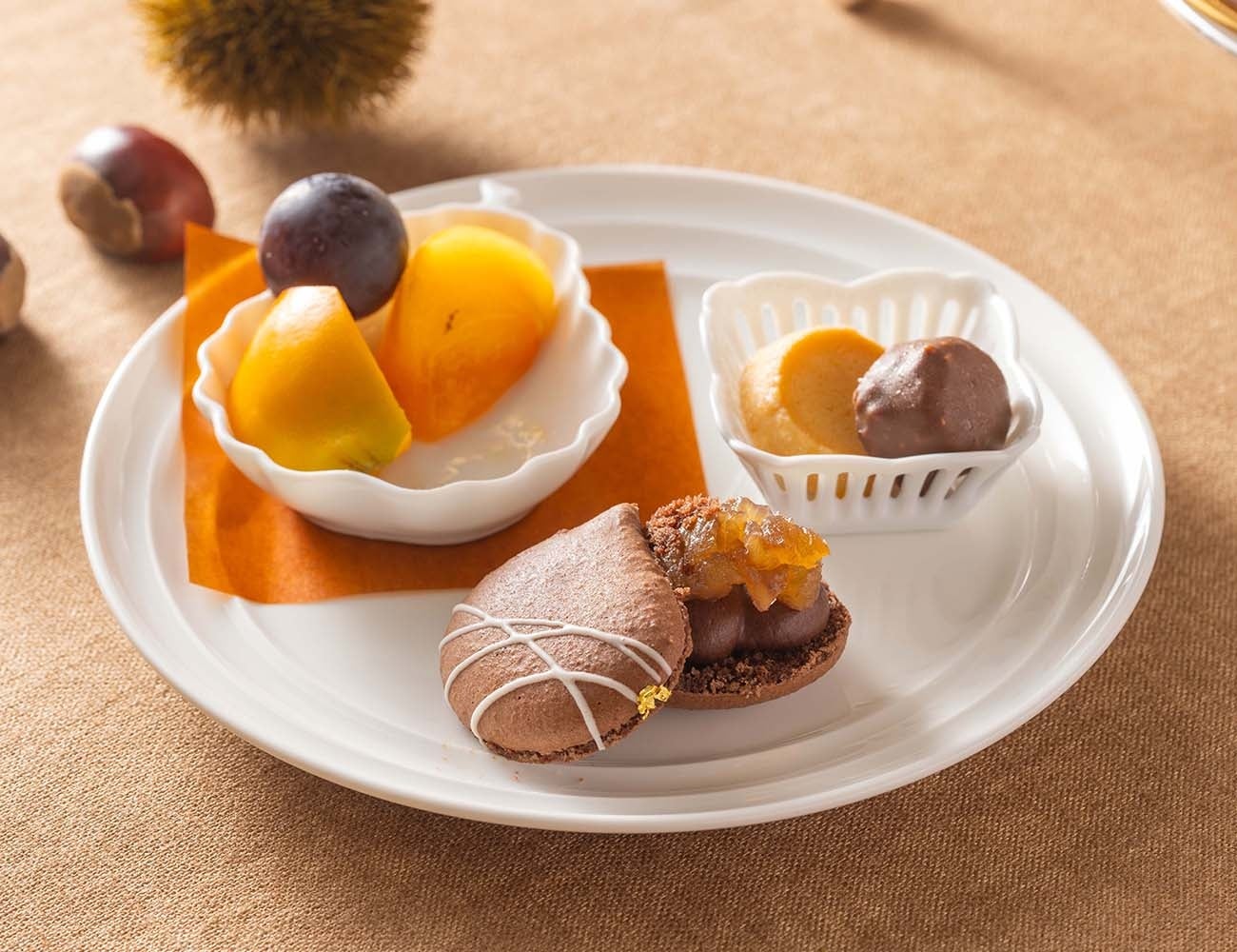 プチガトー〔マロンジュレと洋梨ムースのベリーヌ / フランボワーズとカラメルマロンのシュー / 和栗モンブラン / 抹茶とゆずのプティフール / 栗とショコラのマカロン / ディアマン / ショコラ(ロッシェレ)〕 / フルーツ(柿、巨峰) /