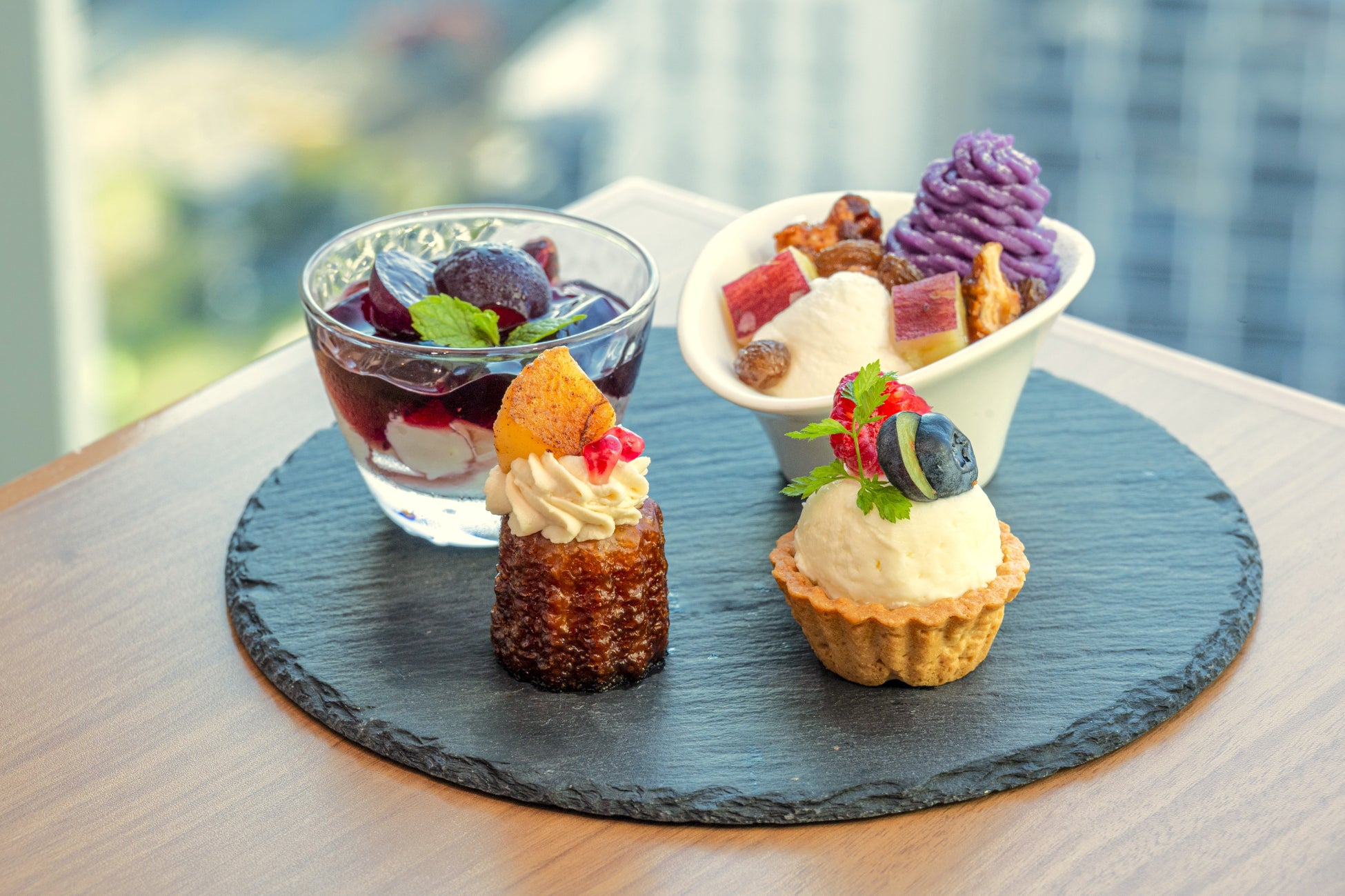 スイーツは秋ならではの旬の食材にアレンジを施してご提供します。なかでもおすすめは、コーヒーとの相性が良く、栗の食感が程良いアクセントとなる一口サイズの濃厚なブラウニーです。ホクホクとした食感とほんのりとした甘みが特徴の栗を甘露煮で甘く鮮やかに仕上げ、しっとりとした食感のブラウニーに忍ばせました。また下段に並ぶ、旬の色鮮やかな紫芋を使用したモンブランは、アクセントにラムレーズンを忍ばせ、トッピングとして「芋の甘露煮」とキャラメリゼしたクルミを添え、「栗」と「芋」の絶妙なマリアージュをお楽しみいただける一品です。さらに口直しの一品として、濃厚なヨーグルトのパンナコッタと甘酸っぱい旬のぶどうを使用した「ヨーグルトのパンナコッタとぶどうのジュレ」では、さっぱりとした爽やかな味わいをご堪能いただけます。