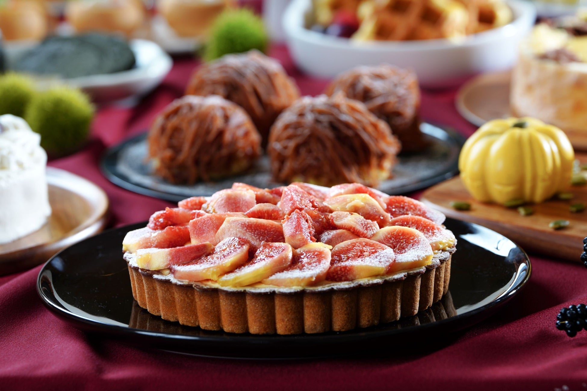 さつま芋とリンゴの竹炭パウンドケーキ、いちじくのタルト、柿の黒糖寒天寄せ、