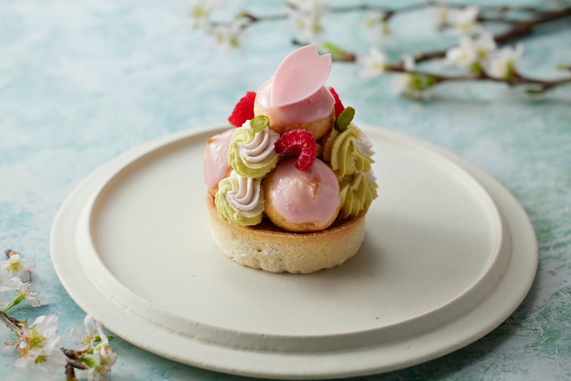 ヨーグルトフランを入れて焼き上げたタルト生地に、桜のグラサージュでコーティングしたミニサイズの桜のシュークリームを盛り付けました。周りにフランボワーズとピスタチオのシャンティ―クリームをあしらい、葉桜までの移ろいを彷彿とさせるスイーツです。