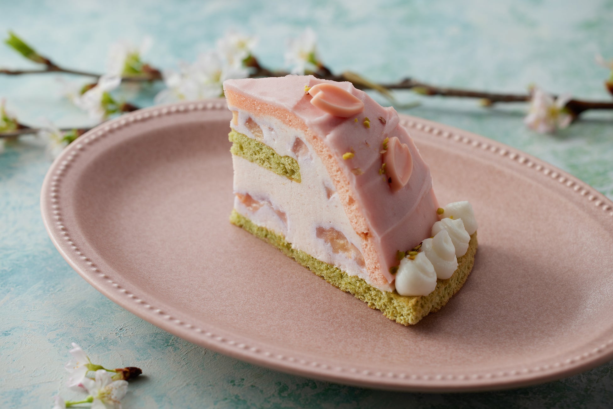 ふんわりとした抹茶と桜風味のスポンジに、さっぱりとした桃のムースとジューシーな果肉を入れました。白餡と生クリーム、桜のペーストを混ぜた濃厚なクリームでコーティングし、桜の花びらを模したチョコレートをあしらった、多様な味わいのハーモニーと春らしい見た目もお楽しみいただける一品です。