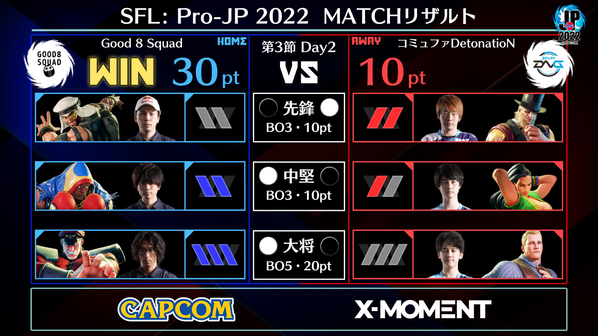 ポイント10対10で迎えた大将戦。アウェイ側の「コミュファDetonatioN」は竹内ジョン選手のコーディーに運命を託す。対する「Good 8 Squad」はどぐら選手のベガが迎え撃つ。どぐら選手は中間距離の技打ちの上手さに加えて、竹内ジョン選手のコーディーがやりたいことを完全に封じる対策を見せて見事にストレート勝利。