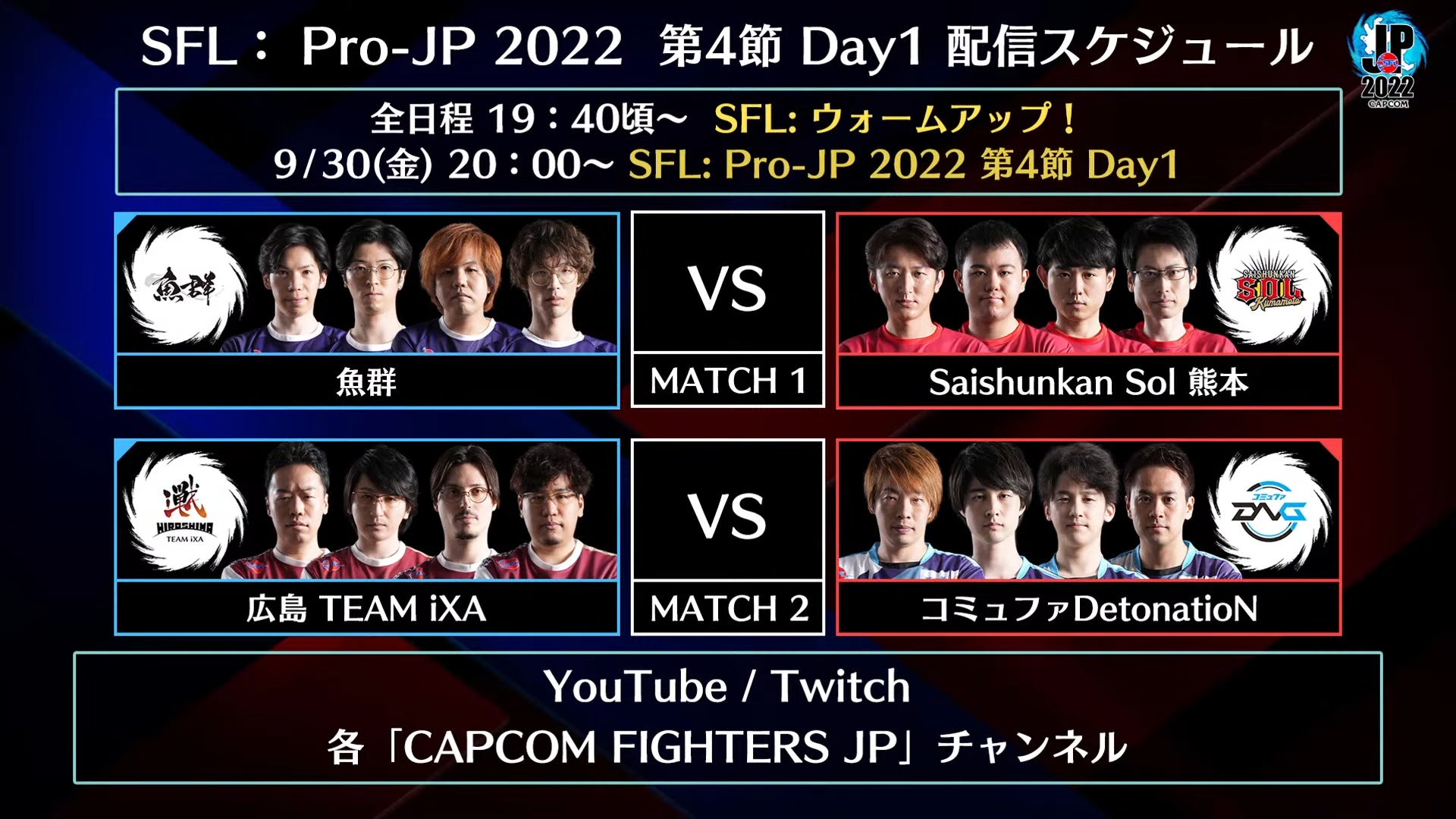「ストリートファイターリーグ: Pro-JP 2022」第4節Day1は、9月30日(金)20時から「CAPCOM Fighters JP」の公式YouTube、Twitchチャンネルにて配信します。