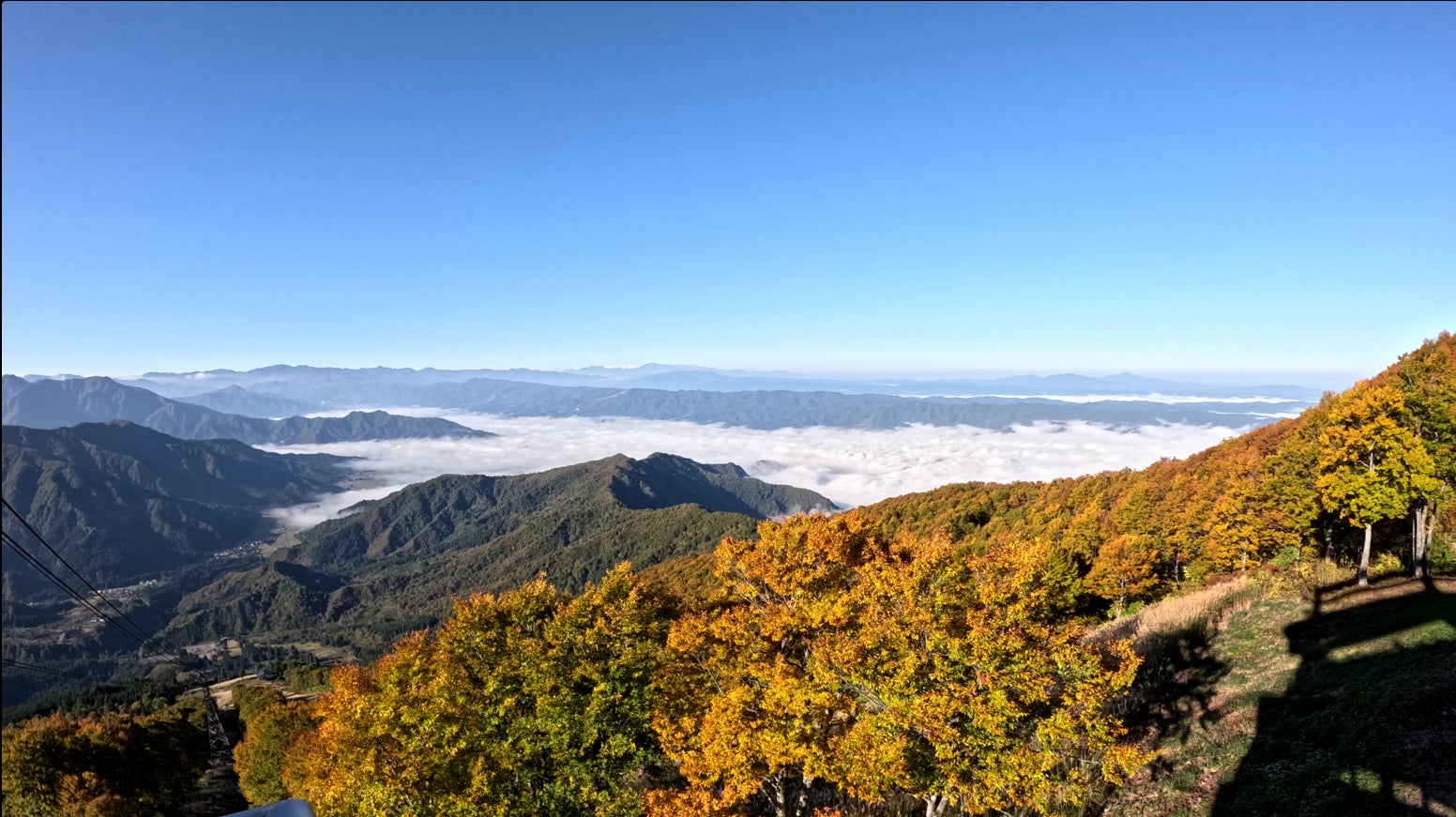 また、秋の時期は通常の時期に比べて雲海の発生率が高く、雲海が発生した日には、朝一番で運行する「雲海鑑賞早朝特別便」で、山頂から雲海を眺めることができます。