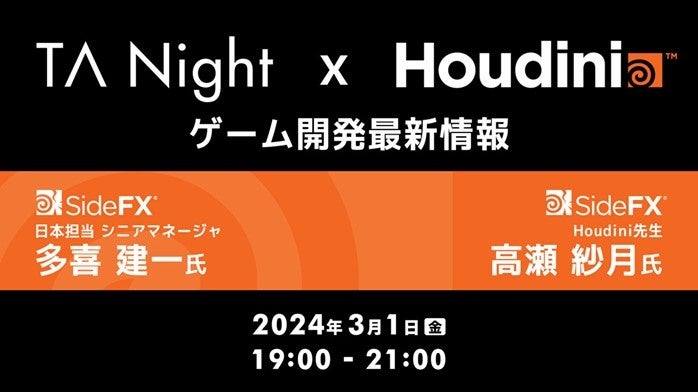 株式会社クリーク・アンド・リバー社(C&R社)は、3月1日(金)、テクニカルアーティスト(TA)の方やMayaを使用する3DCGデザイナー、エフェクトデザイナーの方を対象に「TA Night × Houdini ゲーム開発最新情報」を開催します。