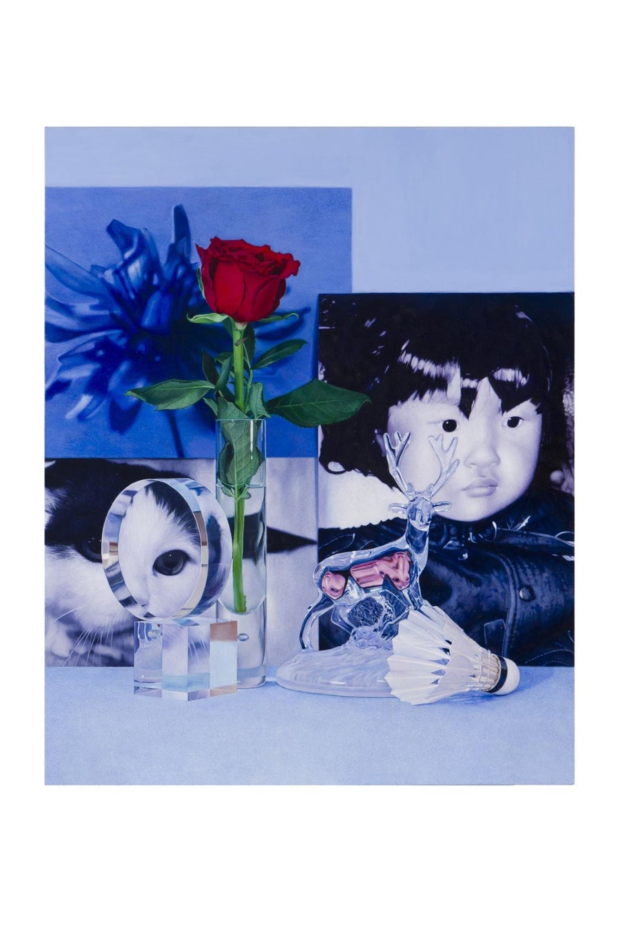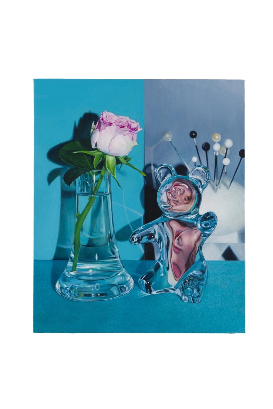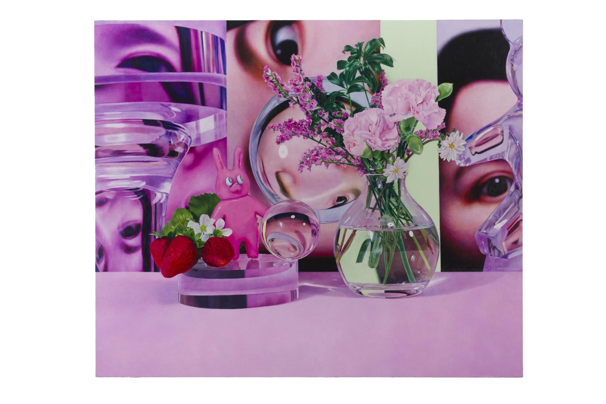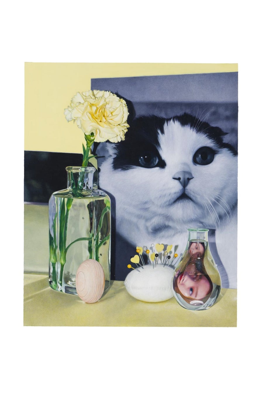 「自分自身を確認するための日常的な行動」として絵を描く北島麻里子の作品には、透明なガラスでできた花瓶の後ろ側や、その脚の中に写り込む自身の肖像画が描かれており、今回の展示では、新作を含む約20点の作品を展示・販売いたします。