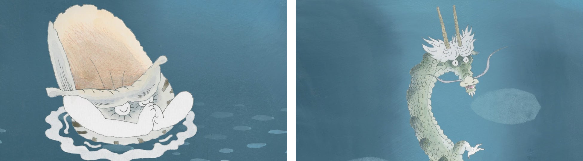 今回制作されたアニメは、土の中で三千年過ごした「ほら貝」がそこから抜け出して龍の姿になったという、湖西市に古くから伝わる、実にダイナミックな海ノ民話が題材となっています。昔むかし、今からさかのぼること約500年前の室町時代に遠州灘で起きたお話です。あるところにふたりの夫婦がいました。そこに奇妙な声がきこえてきました。不思議に思っていたところ、突然、山がゆれだし、岩の中からほら貝が飛び出してきました。なんとそのほら貝は三千年ものあいだ、岩の中にいたのです。長い年月を経て海に飛び込んだほら貝は喜びにみちあふれ、その身を海の流れに任せて浜名湖にたどりつきました。この時、ほら貝は空高くとびたいと強く願い、竜に変身したのです。