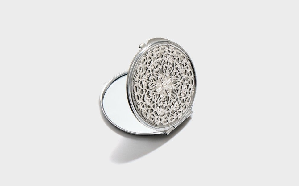 作品の象徴的なオーナメントをモチーフに、繊細なレリーフを施した折りたたみ式ミラーは拡大鏡付き。エレガントな印象で、お出かけ先でのお化粧直しの時間も優雅に演出してくれます。手のひらサイズのコンパクトなサイズ感は収納や持ち運びにも便利です。