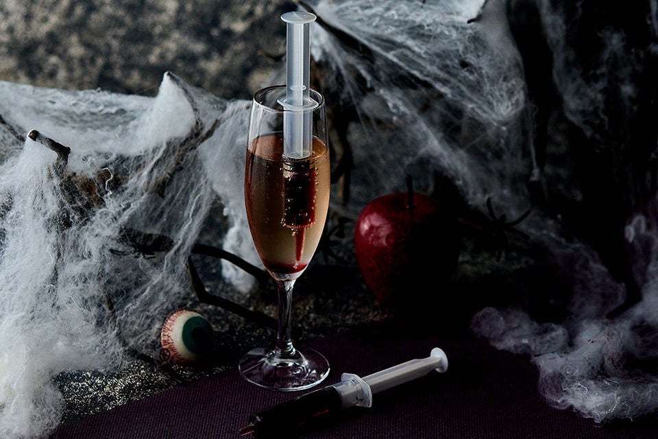 ハロウィンパーティーの最初の1杯としてお届けするのは、注射器でベリーシロップを注入する、不気味なスパークリングワイン。赤色に変わっていくグラデーションをお楽しみいただける、本イベント限定のスペシャルウェルカムドリンクです。