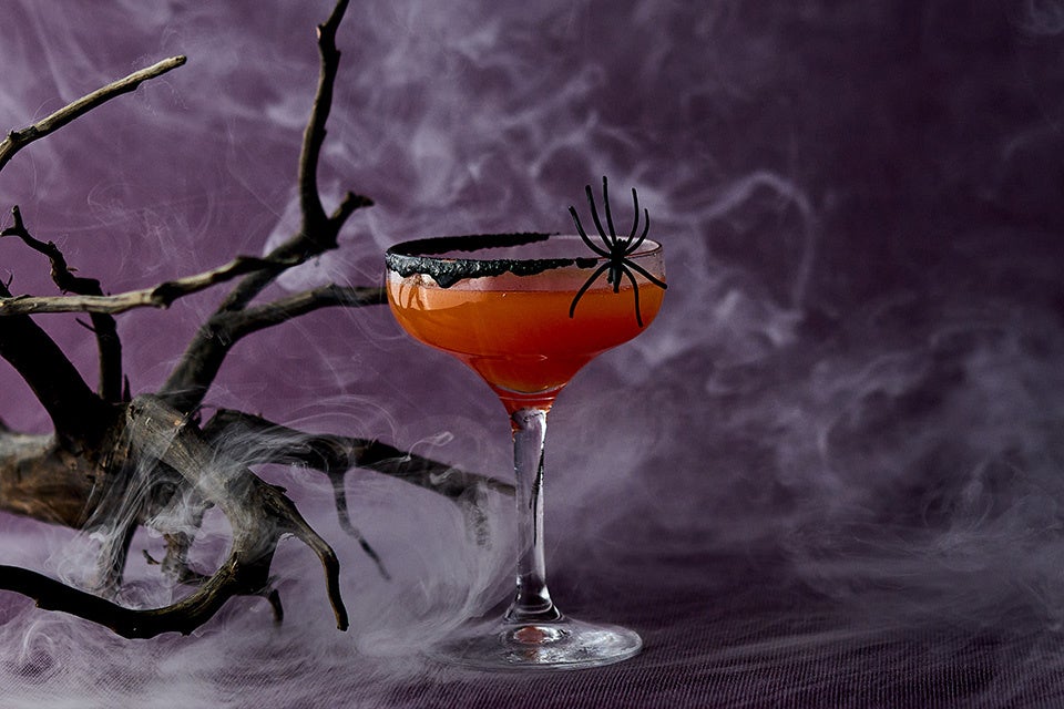 ハロウィンといえば「秋の収穫の色」であるオレンジと、暗闇や魔女を連想させるブラックをあしらった見た目にもキャッチ-に楽しめるモクテル(ノンアルコールカクテル)。オレンジとレモンの爽やかな味わいが楽しめます。スパイダーに見立てた飾りがハロウィン感を倍増させます。