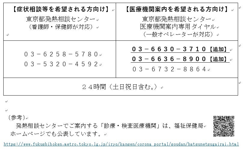 「東京都発熱相談センター 医療機関案内専用ダイヤル」の電話番号の追加について