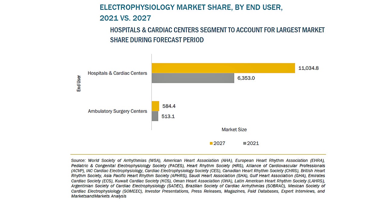 電気生理学 (EP)の市場規模は、2021年の68億米ドルからCAGR9.4%で成長し、2027年には116億米ドルに達すると予測されています。電気生理学検査は、複雑な心疾患を診断・治療するために、患者の心臓の電気的活動や電気経路を調べるために実施されます。これにより、電気生理学者は心拍障害の原因を理解し、必要な治療法を提案することができます。電気生理学とは、心臓の電気的活動を分析・診断するために研究される心臓の電気システムのことで、侵襲的なカテーテルを用いて心臓の電気活動を記録し、その現象を研究します。この研究は、複雑な不整脈や心拍障害を評価するのに役立ちます。