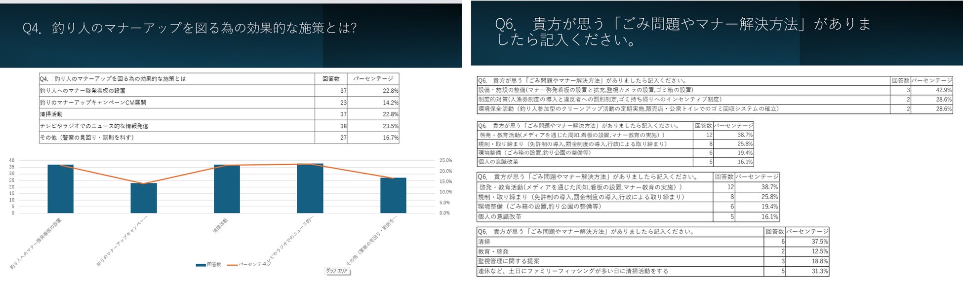 ■マナー向上・解決策として「テレビやラジオでのニュース的な情報発信 」「清掃活動 」「釣り人へのマ ナー啓発看板の設置」という視覚的な注意喚起や広範囲への啓発が効果的との考えが寄せられた。