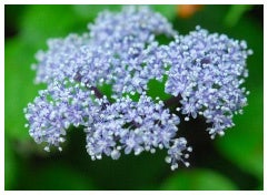 別名はシバアジサイで、関東地方以西の本州、四国、九州に自生します。高さは1~1.5mになる落葉低木です。花は5弁の細かい両性花だけが集まって咲き、ガクアジサイなどに見られる大きな飾り花を持たないのが特徴です。甘い香りを放ち、花粉を運んでくれる昆虫を誘います。花色は薄い青紫色ですが、おしべが長く花の外に出るためやや色調が和らげられ、落ち着いた風情を見せます。当園のコアジサイは6月下旬までお楽しみいただける見込みです。