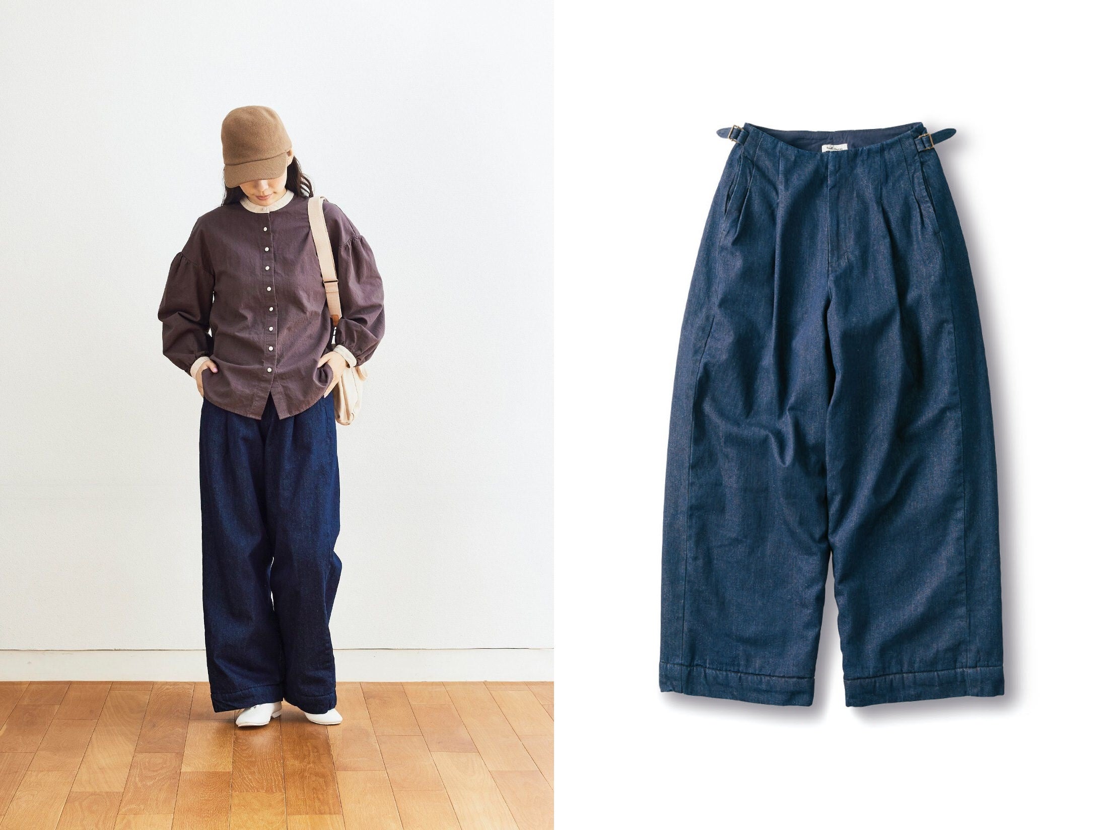 曲線がきれいな、ゆるっとしたワイドシルエットのジーンズですが、裏はもこもこボア仕様になっていて、寒さからしっかりと守ってくれます。フロントのタックや腰まわりのダーツでフィット感を持たせ、はきやすさも抜群です。寒い冬もデニムパンツが楽しめる、うれしい一本です。
