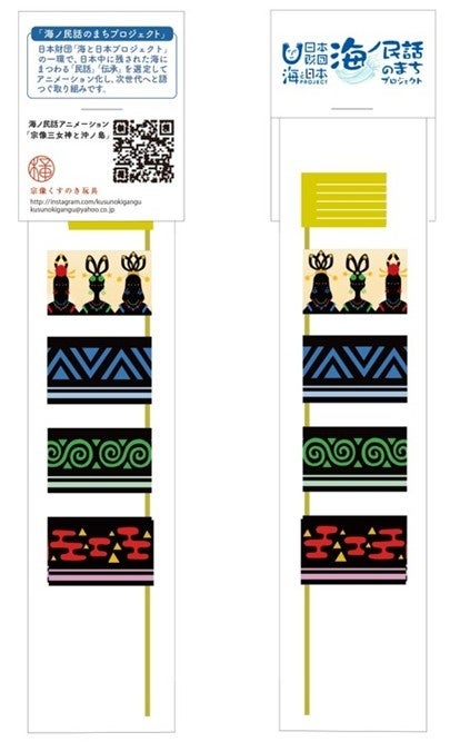 一般社団法人日本昔ばなし協会と日本財団が取り組む「海ノ民話のまちプロジェクト」では、福岡県宗像市に伝わる民話「宗像三女伸と沖ノ島」のコラボレーションとして、福岡県宗像市の宗像くすのき玩具と連携し、「みあれ祭の船 アニメ「宗像三女伸と沖ノ島」完成記念旗」を2025年3月8日(土)から発売開始いたしました。令和7年1月、宗像市が「海の民話のまち」に認定され、短編アニメ「宗像三女神と沖ノ島」が完成しました。それを記念して特別に制作した、宗像くすのき玩具「みあれ祭の船」に立てる替え旗です。