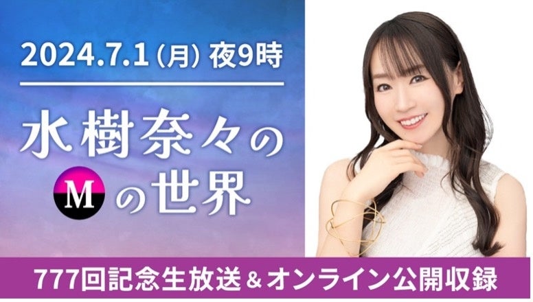 毎週月曜日21時からTOKYO FMで放送中の『水樹奈々のMの世界』は、2008年10月1日にスタートし、7月1日(月)に777回を迎えます。記念すべき777回目の放送は半蔵門からの生放送(※TOKYO FMのみ)!そして、生放送終了後にも「オンライン公開収録」が決定しました。「オンライン公開収録」は動画ポータルサイト「Travel TV」にて、生放送終了後からスタート。番組初の動画配信です!普段なかなかご覧いただけない番組収録に、一緒にスタジオにいるような気持ちでご参加ください。オンライン公開収録の模様は7月8日(月)21時から(※FM愛媛は7月13日(土)25:30から)放送されます。