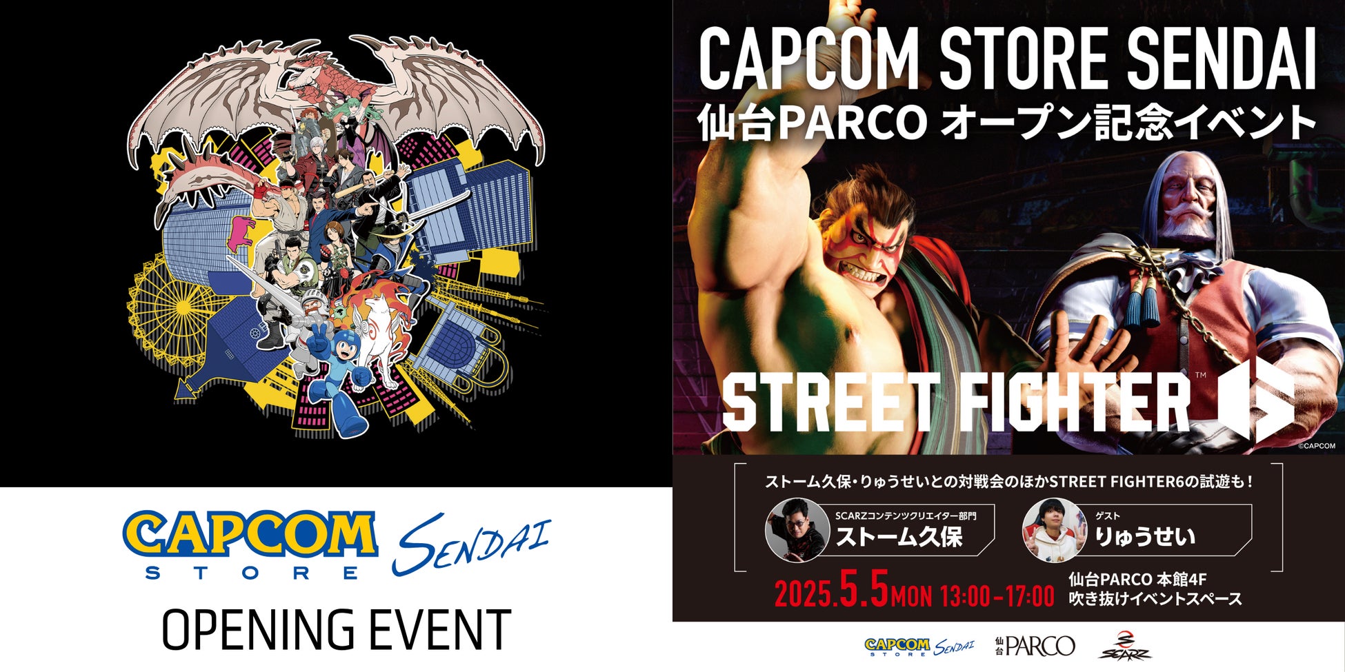 SCARZ(株式会社XENOZ)コンテンツクリエイターのストーム久保選手や、『ストリートファイター6』で大活躍中のりゅうせい選手と交流や対戦ができるほか、ご参加いただいたお客様にはノベルティもご用意しております! 5月5日(月祝)は仙台PARCOに全員集合!