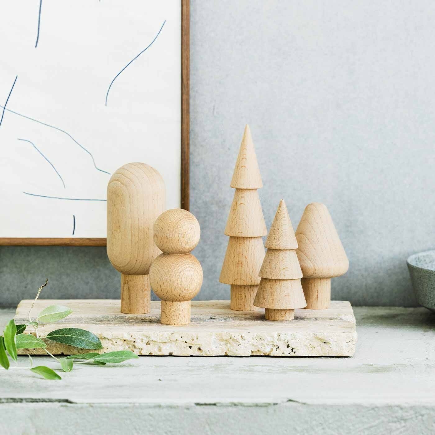欧州向けの子ども用おもちゃなども手掛ける職人さんが、1本の木材から削り出し製作した、ブナ材のオブジェです。集合させたときに愛らしいバランスが完成するよう、あえて高さやサイズにバリエーションを持たせています。お好みで色を塗ってアレンジしたり、無塗装面にアロマオイルを垂らしたりして楽しめます。