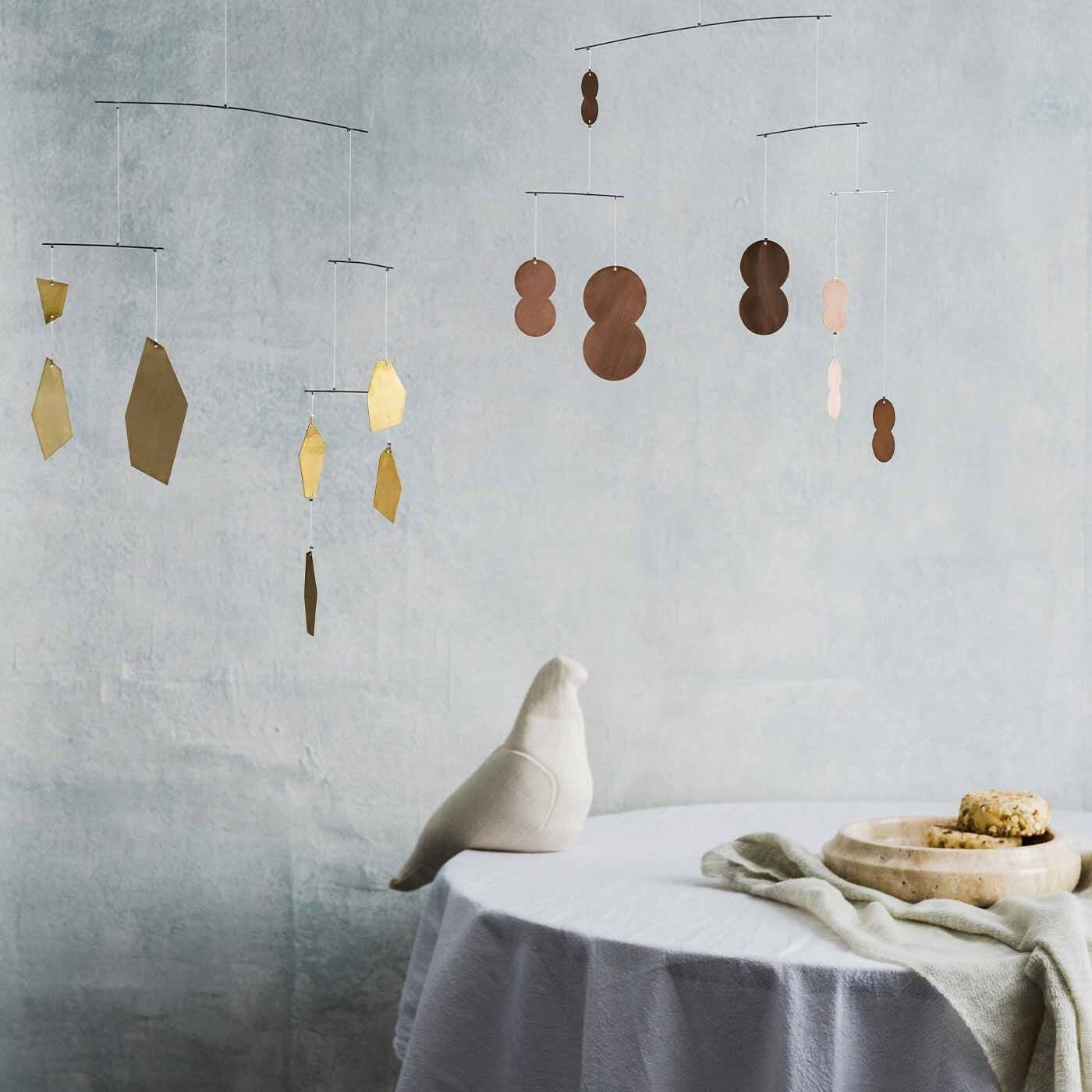 グラフィカルな形のモチーフが、ゆったりとお部屋を漂うモビールです。モチーフはあらかじめ型抜きされており、気軽に手づくりできます。ゴールドカラーの真ちゅうモチーフと、ピンクがかった銅モチーフが、回転するたびやさしく光を反射し、きらりと高級感ある趣とともに、空間に豊かな奥行きを演出します。軽いので、マスキングテープなどを使って天井に固定できるので、簡単に部屋を彩ることができます。