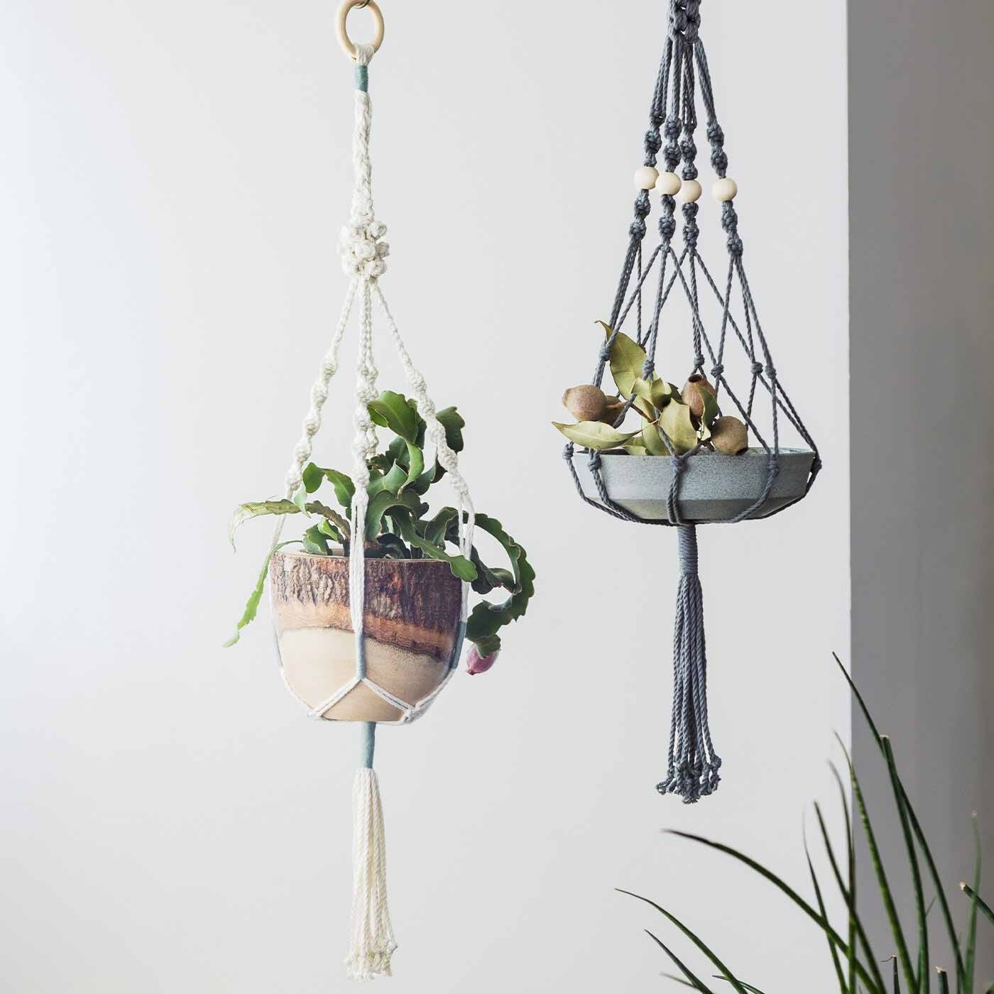 シーモノ・オリジナルカラーのマクラメ糸を使用した、プラントハンガーのキットです。ニュアンスのある色糸や、ウッドビーズ、メタルパーツなどを組み合わせてバリエーションを出しています。複数並べてつるしても単調に見えないよう、全体のデザインバランスにもこだわりました。お手持ちのさまざまな形状のポットやグリーンと組み合わせて、表情豊かな空間を演出できます。