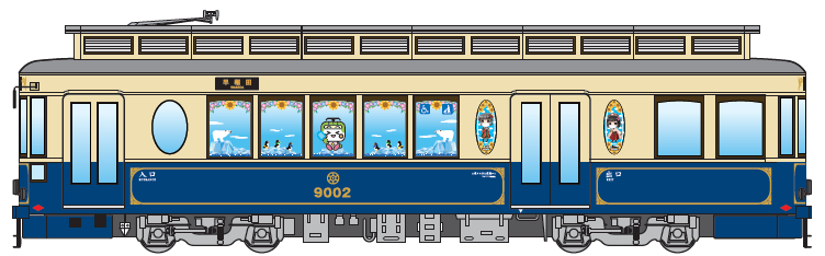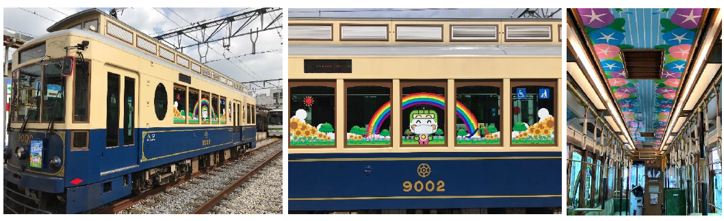 「都電納涼号」は、9002号車(青いレトロ車両)の車内や窓に夏らしく涼しげなデザインの装飾を施すとともに、車両前面にヘッドマークを装着し、車内及び沿線に涼をお届けいたします。