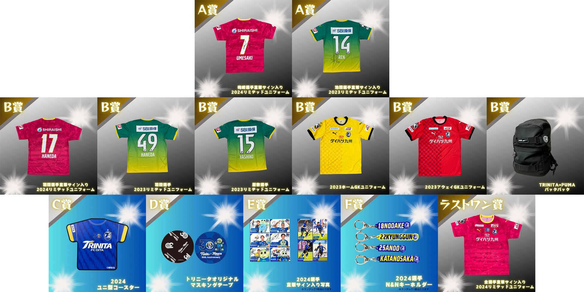 2024選手サイン入りのユニフォームや写真、大分トリニータオリジナルグッズなど