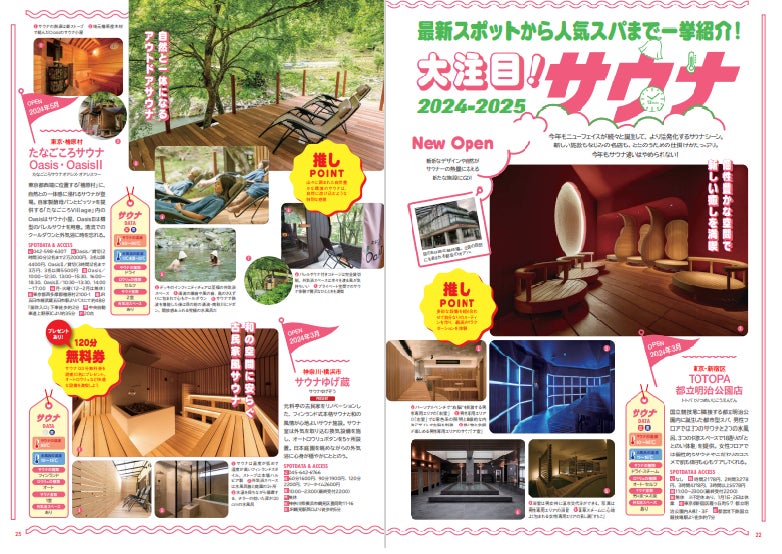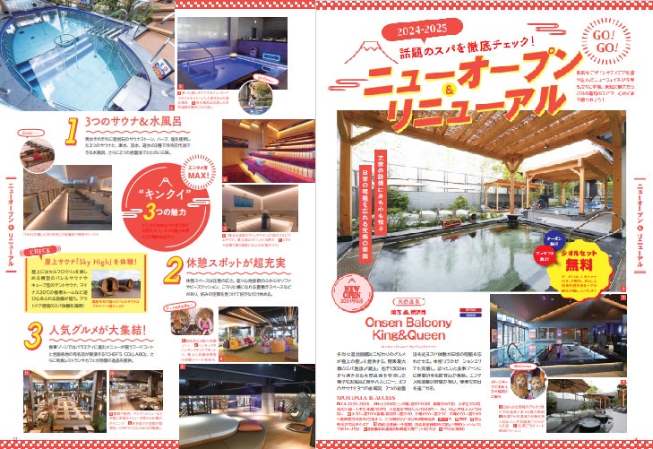 本誌では 今すぐ行きたいスーパー銭湯&サウナ&日帰り温泉をたっぷりと紹介。また例年大人気のクーポン・プレゼントはもちろん、1年間使い放題の「温浴パスポート」も充実し、お得な特典がたっぷりの一冊となっております。