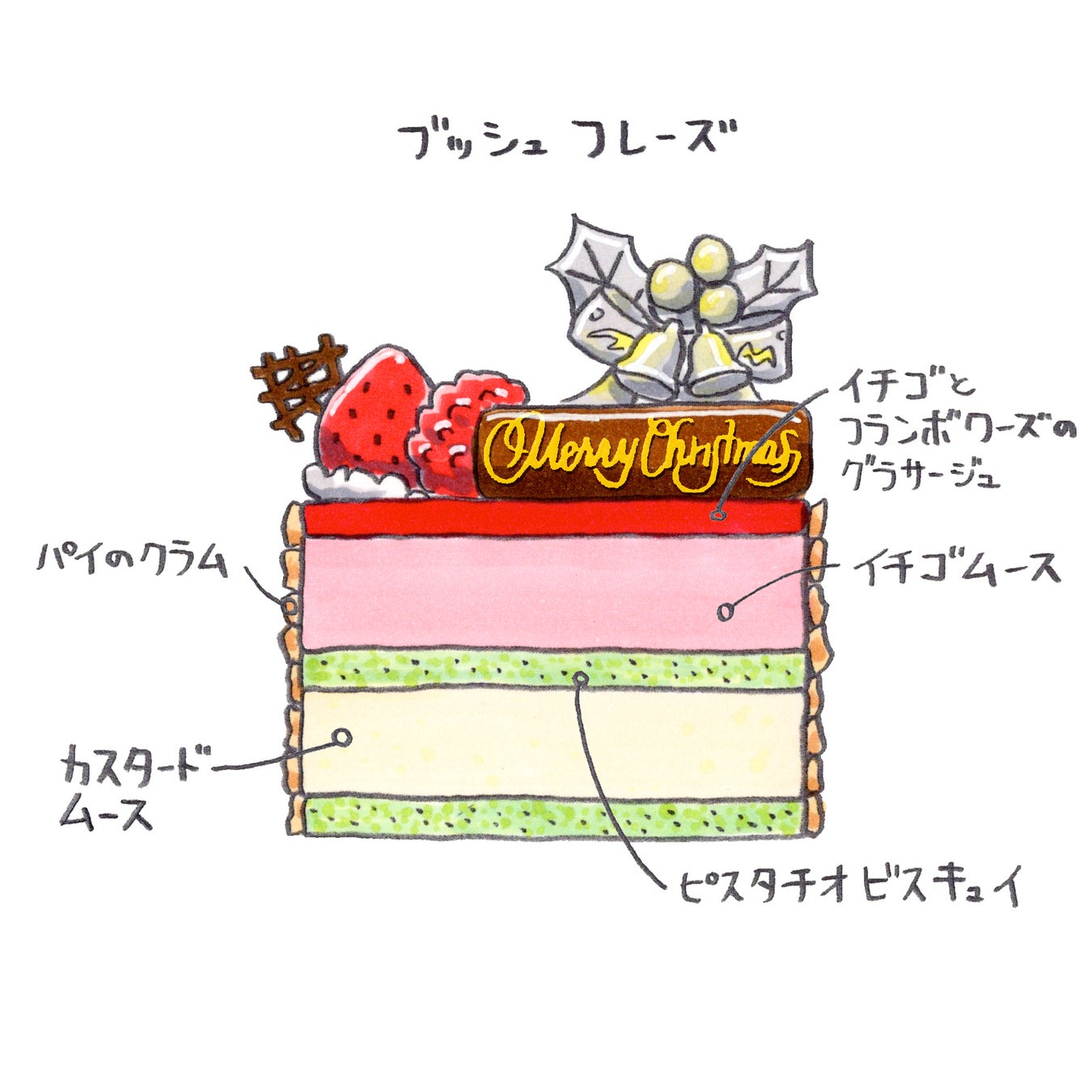 爽やかな酸味の苺と濃厚なカスタードのムースケーキ。ピスタチオのビスキュイとパイクラムがアクセントの2024年新作ケーキです。