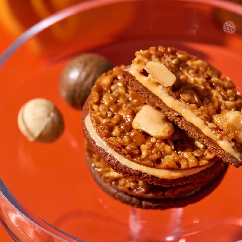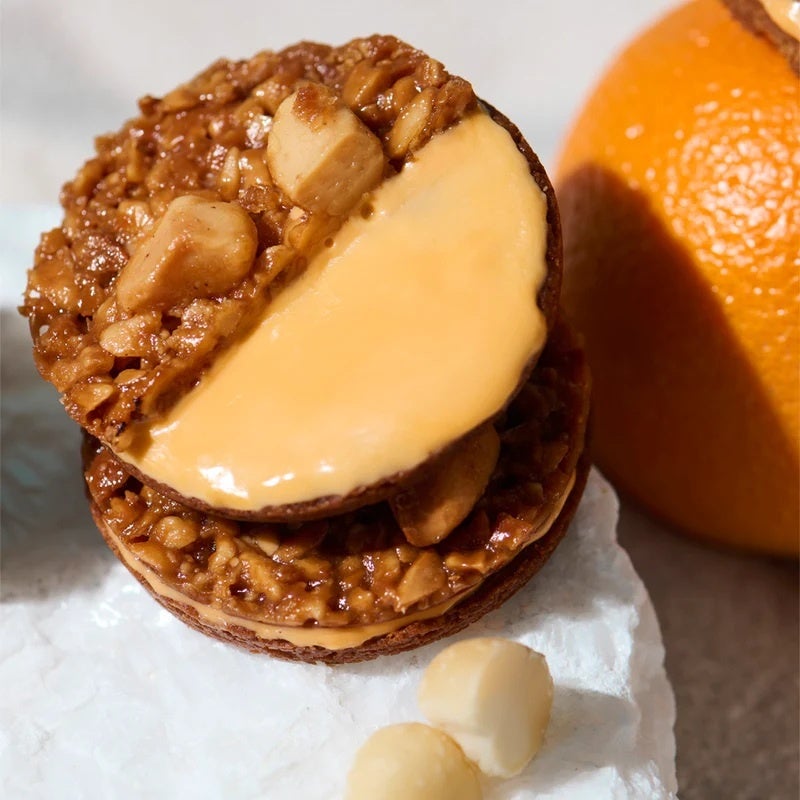 “ナッツの王様”マカダミアナッツの形が異なる2種を使った甘く香ばしいザクザク食感のチュイールに、オレンジがほんのり香るチョコレートコーチングとザクホロオレンジクッキーを重ね合わせました。香ばしさとほんのりとした酸味、やさしい甘さが口の中で一体となる奥深い味わいと、ザクザク食感が特徴的な3層で出来た新感覚フロランタンです。